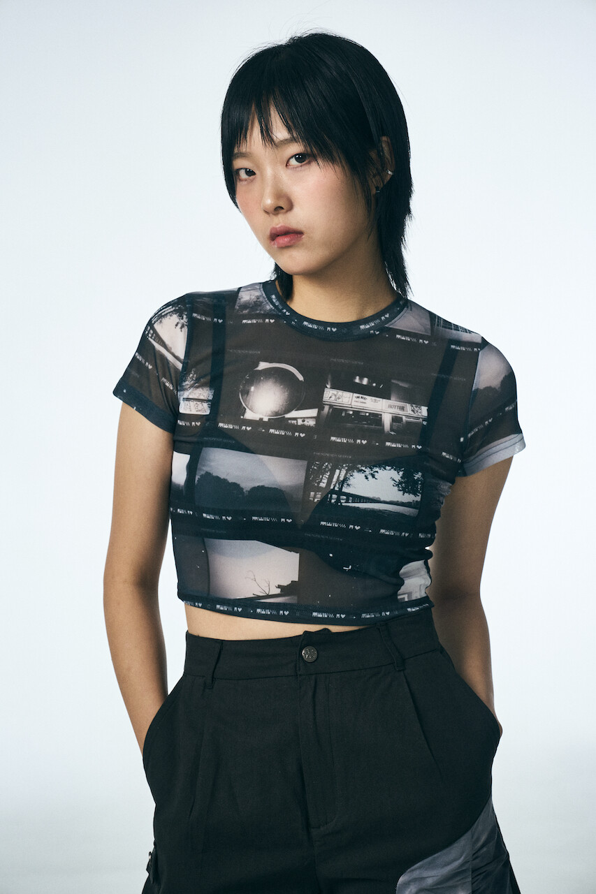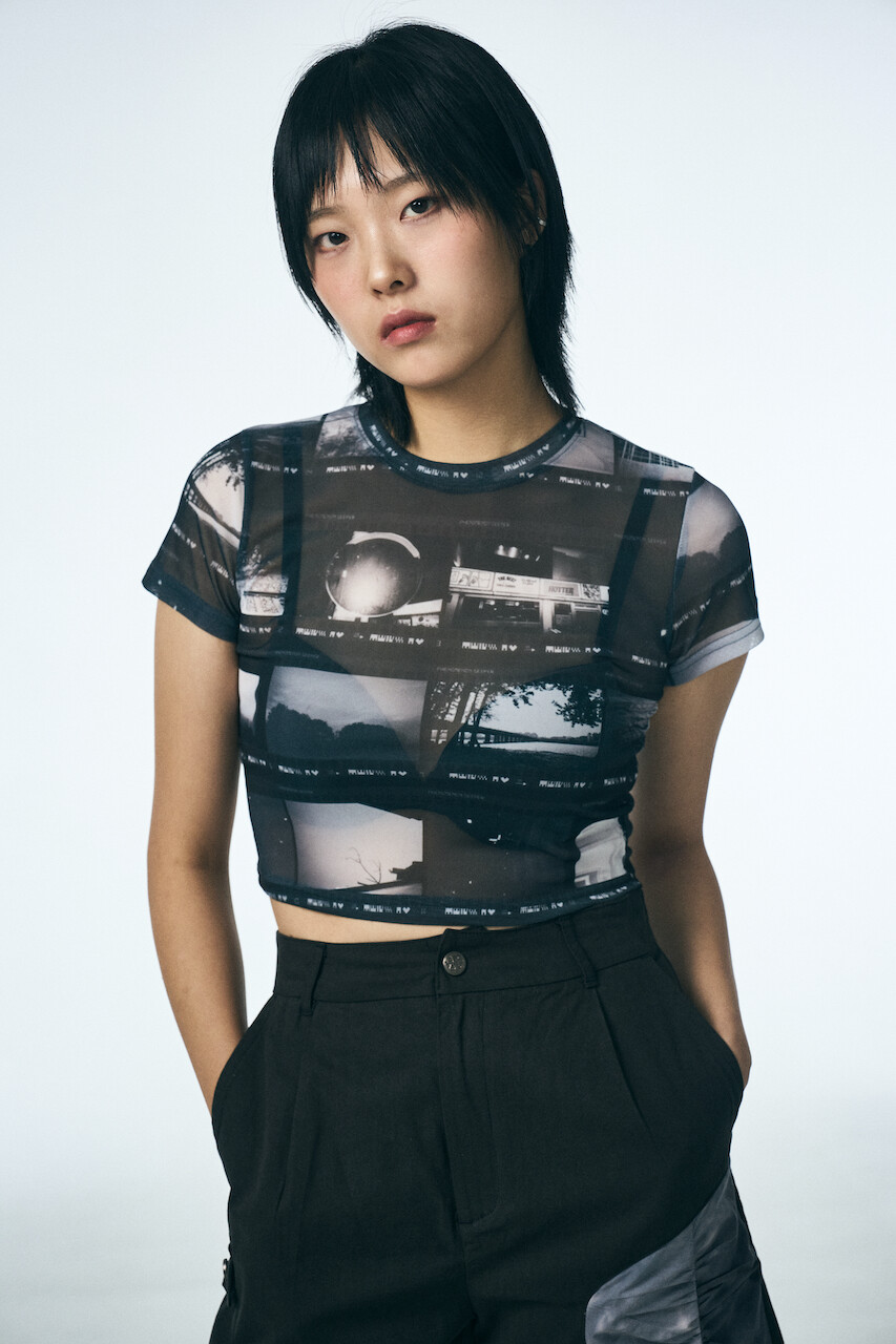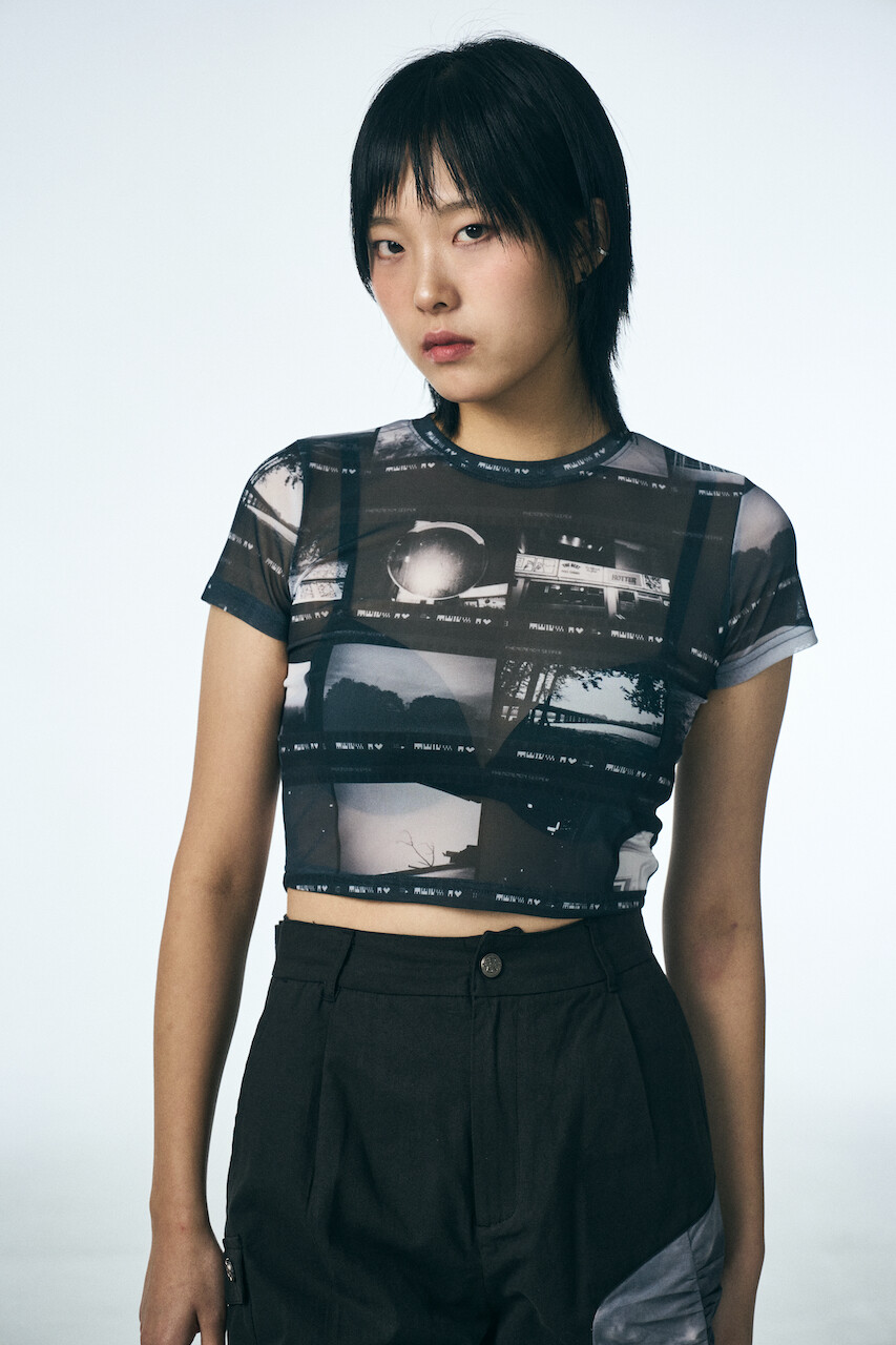 필름 숏 슬리브 크롭 티셔츠