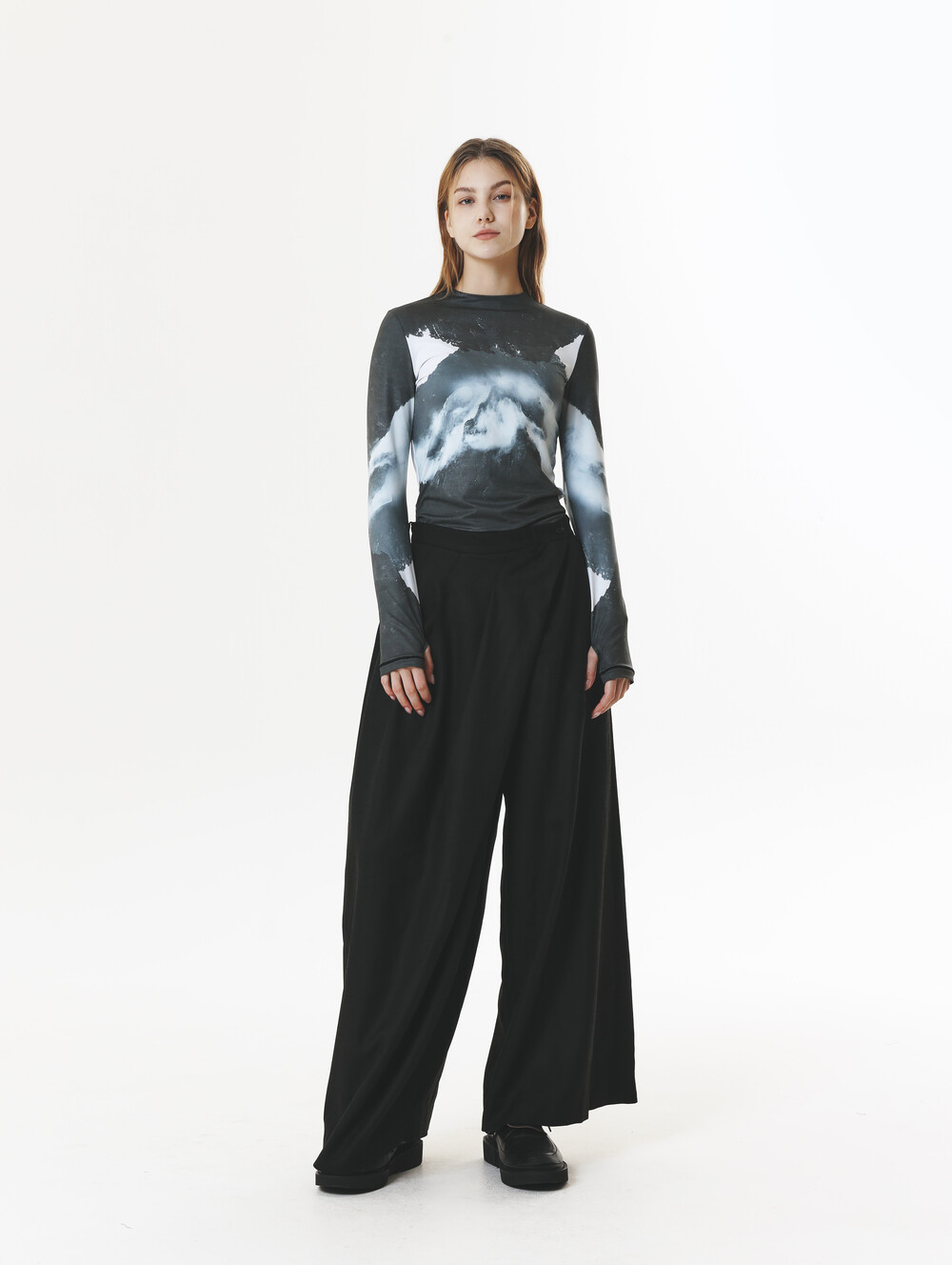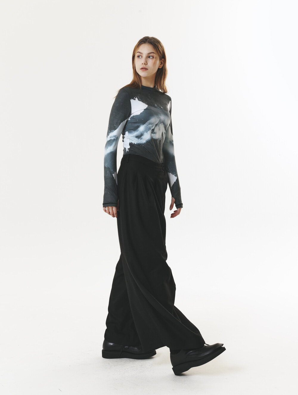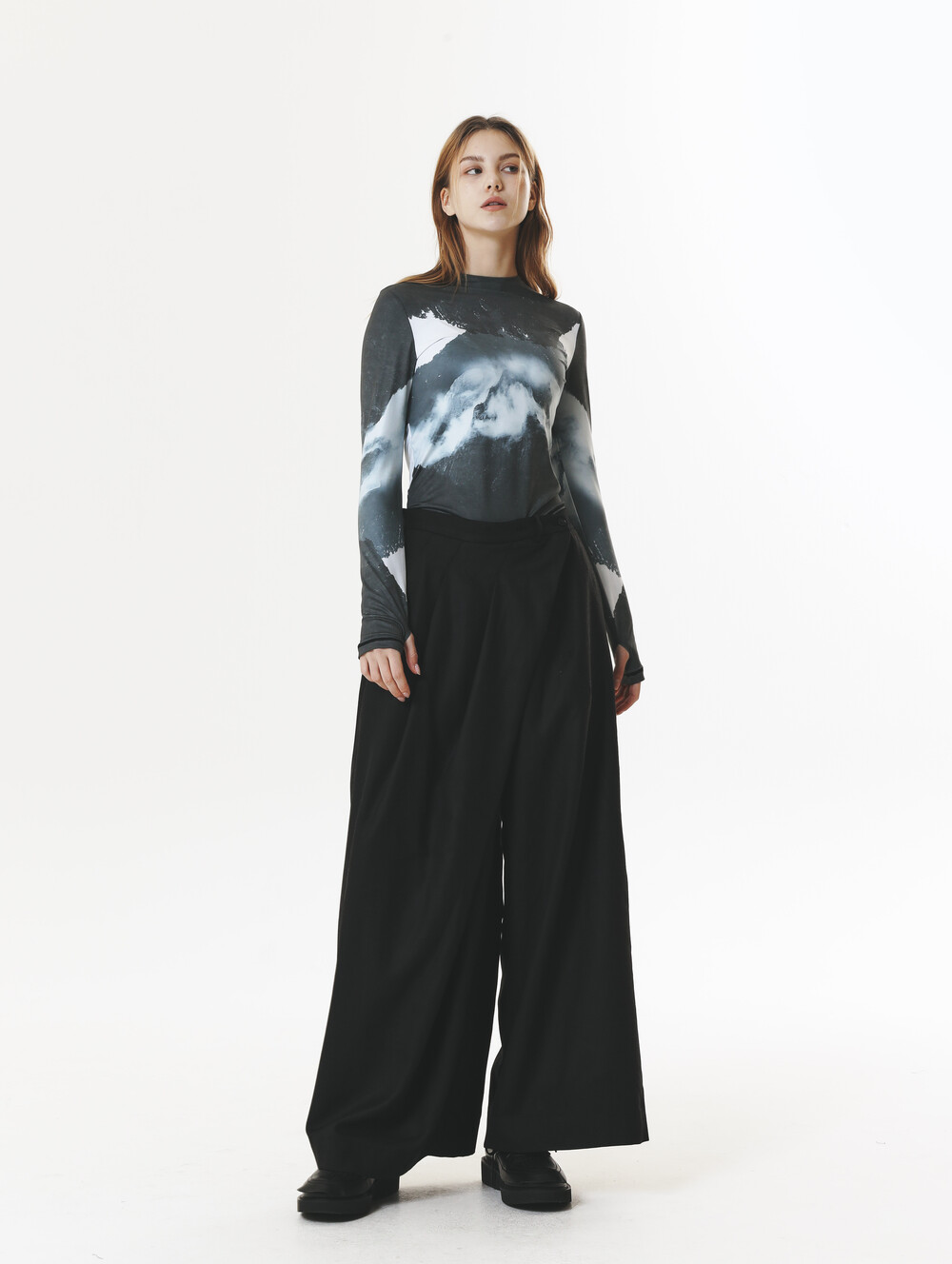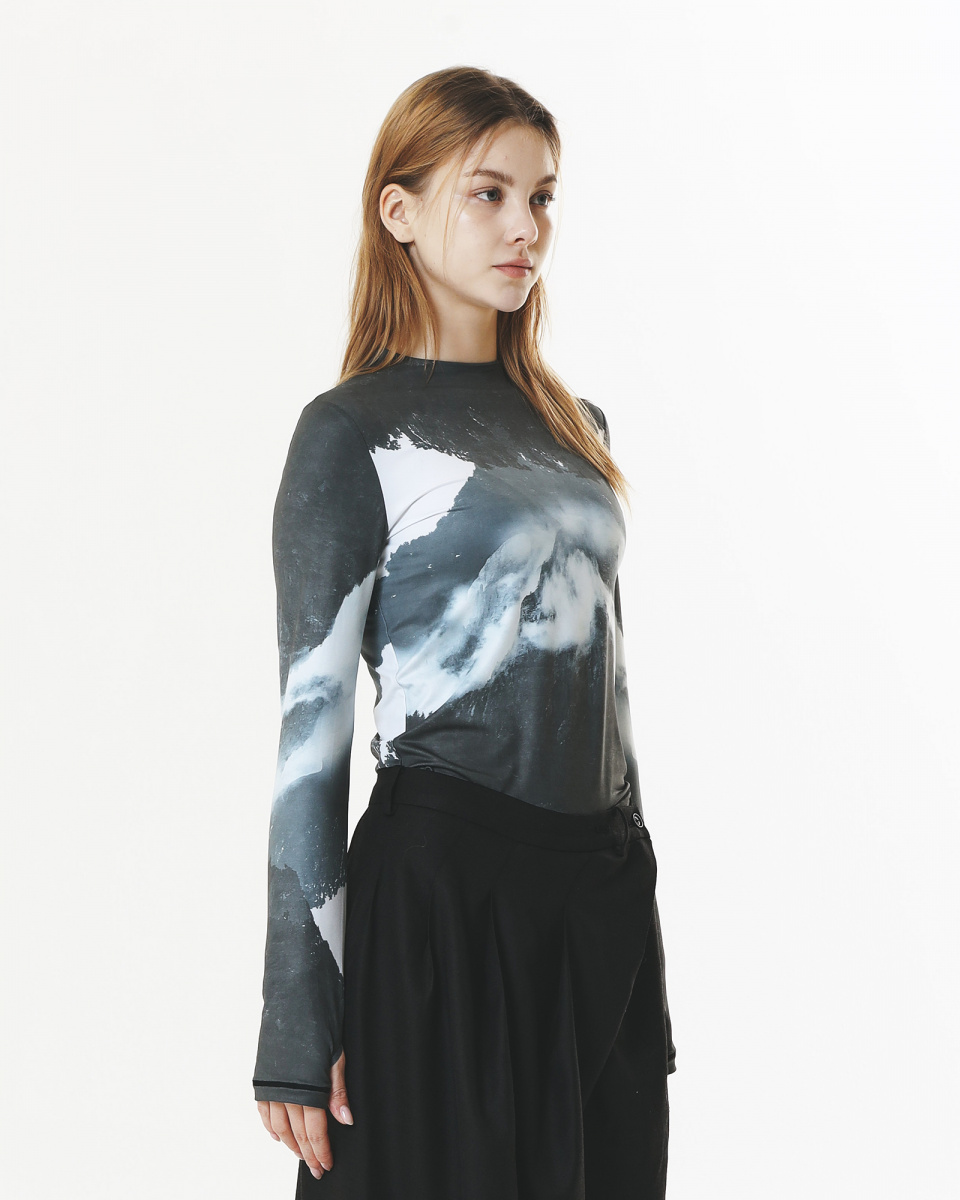 넥 봉제라인이 없는 모크넥 티셔츠입니다. 안개가 자욱한 산맥의을 디지털 프린팅하였고, 소매단에 핑거링과 겉으로 들어나는 아웃스티치가 포인트입니다.