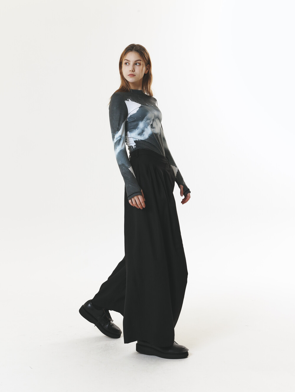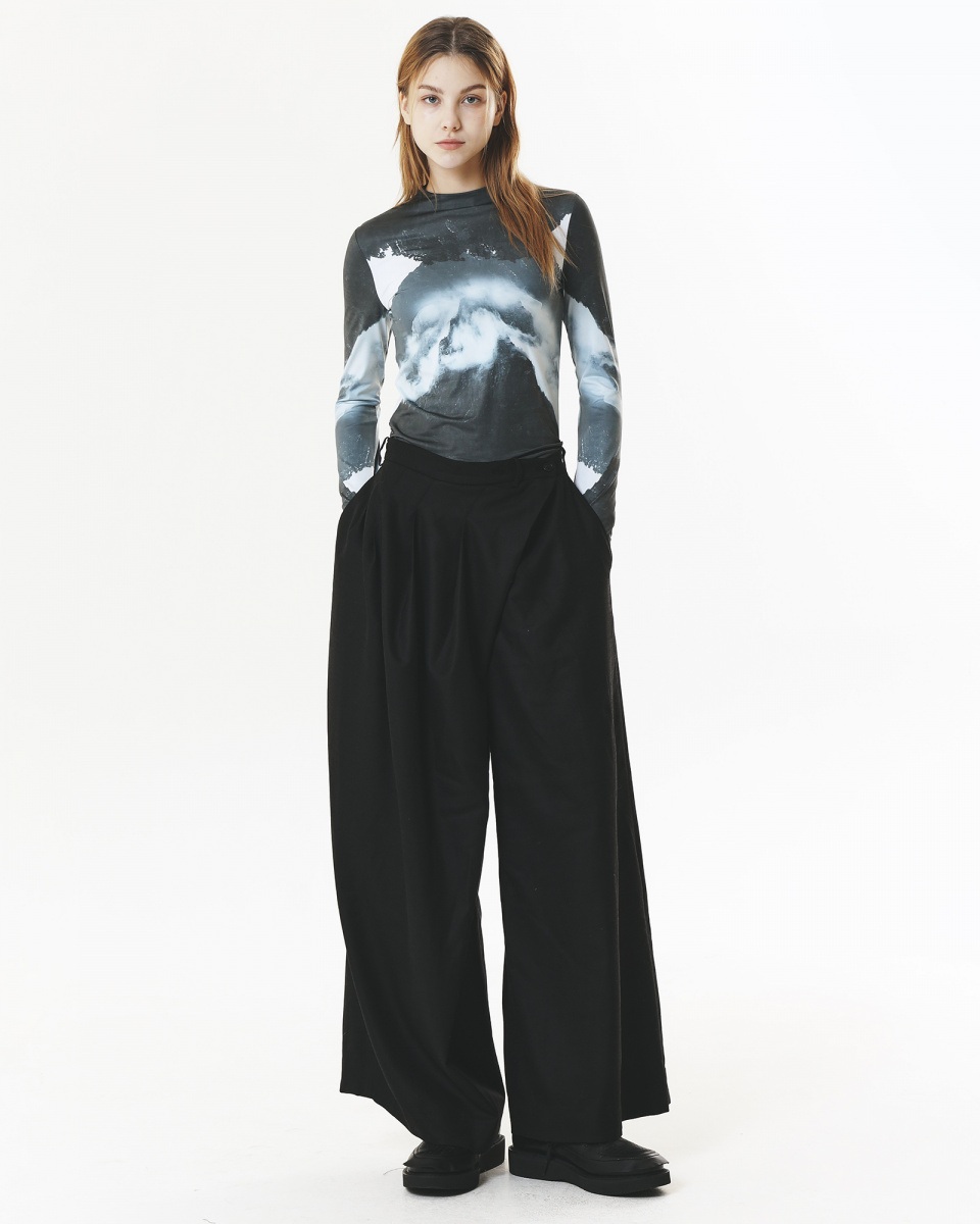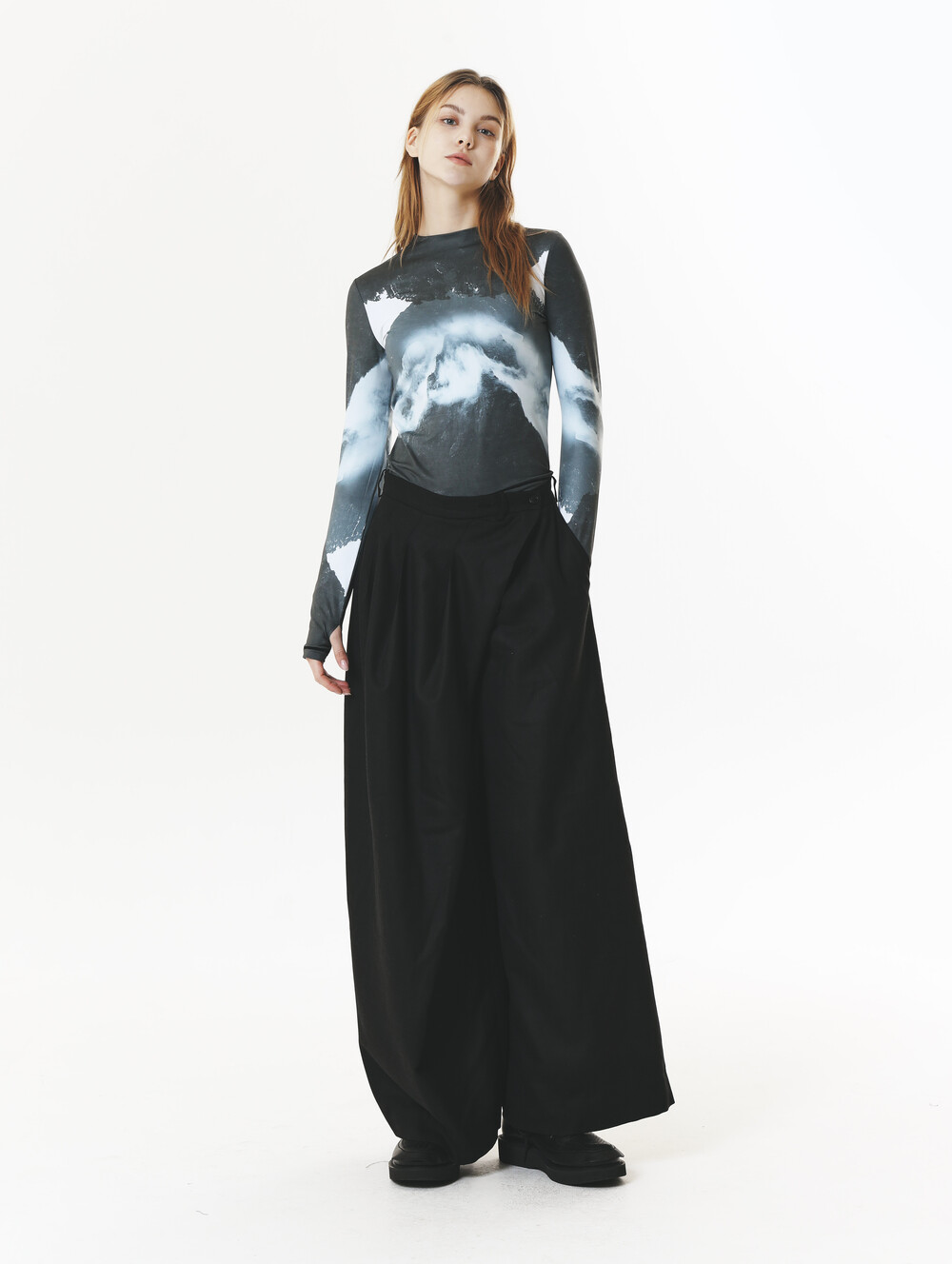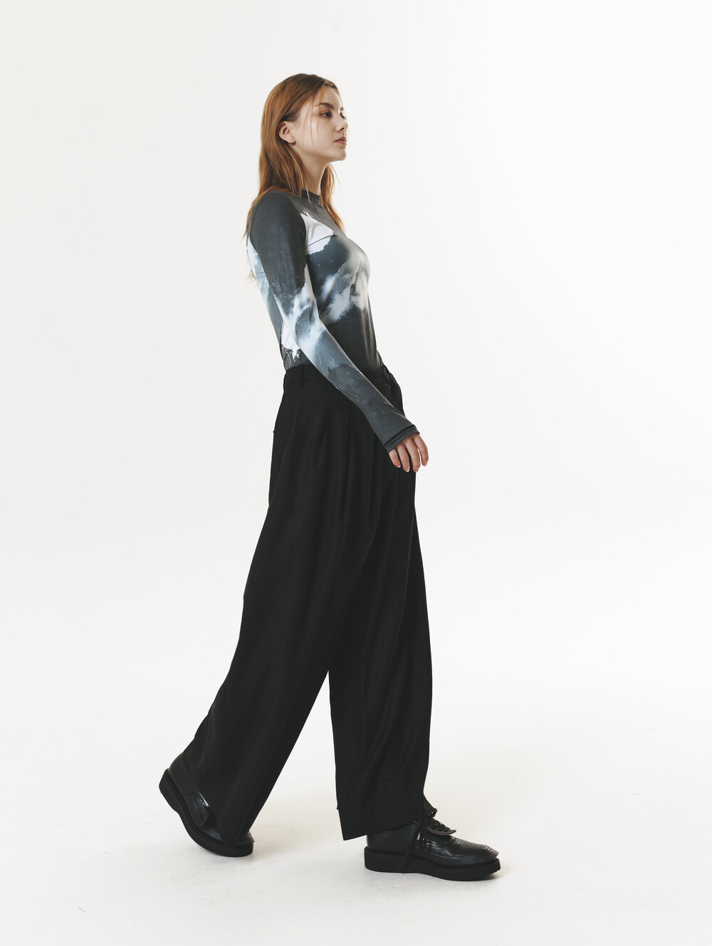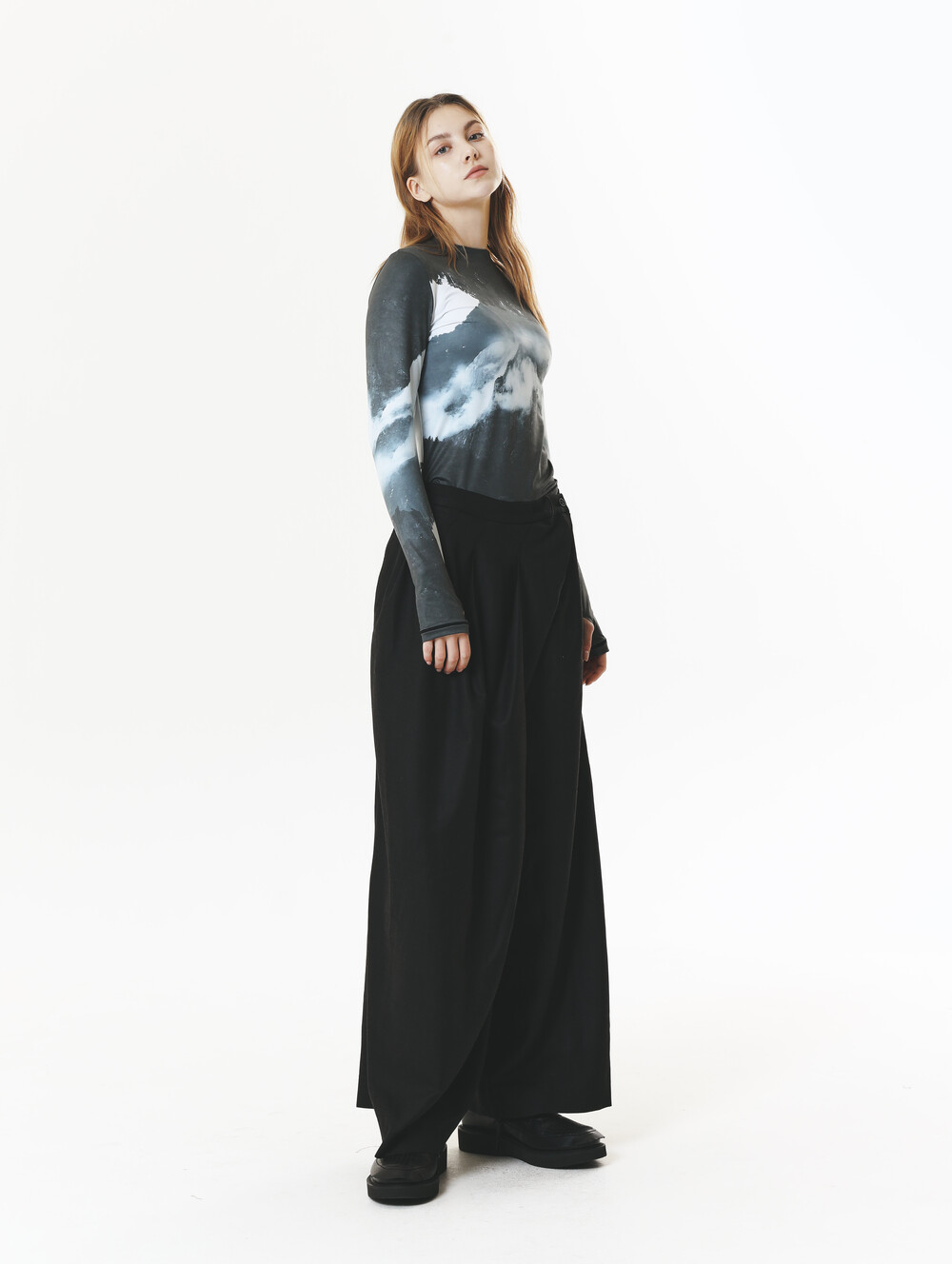 넥 봉제라인이 없는 모크넥 티셔츠입니다. 안개가 자욱한 산맥의을 디지털 프린팅하였고, 소매단에 핑거링과 겉으로 들어나는 아웃스티치가 포인트입니다.