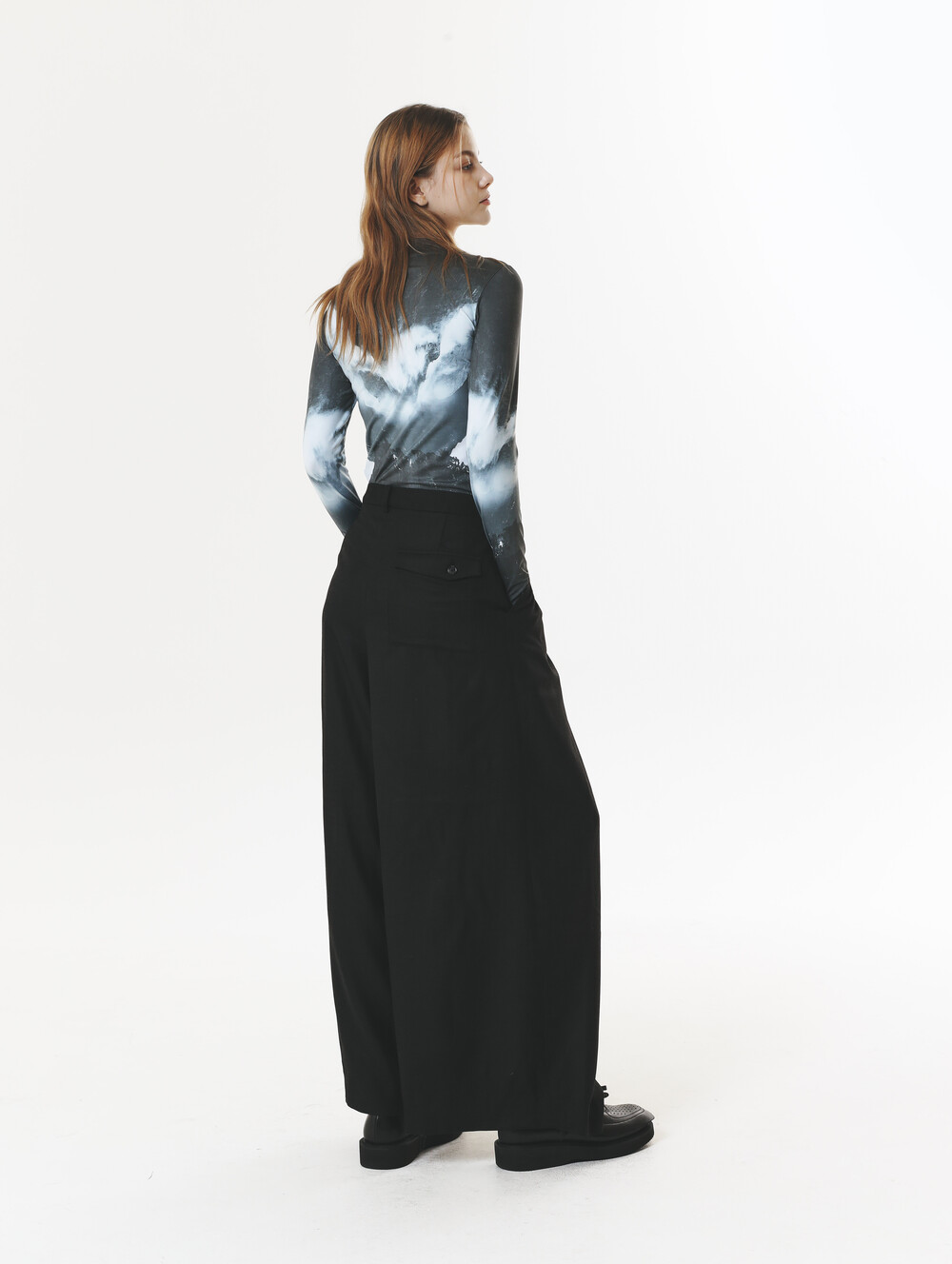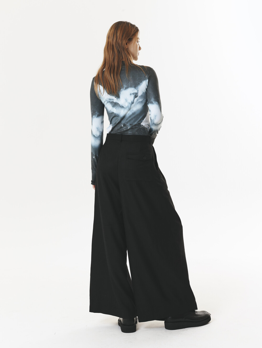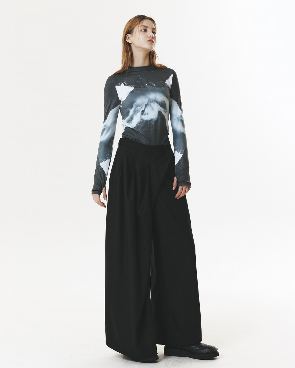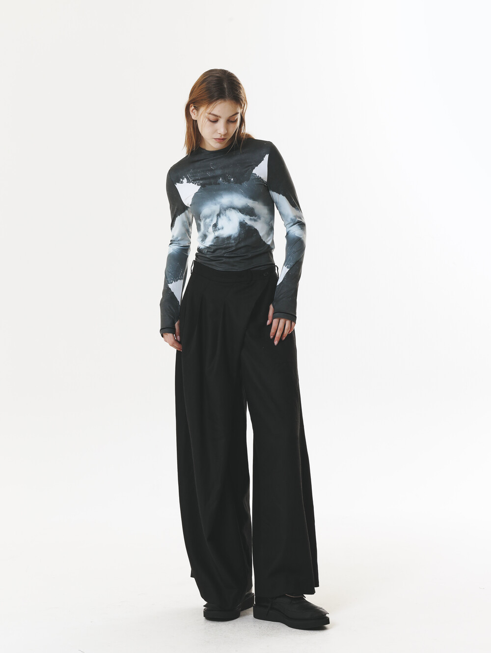 넥 봉제라인이 없는 모크넥 티셔츠입니다. 안개가 자욱한 산맥의을 디지털 프린팅하였고, 소매단에 핑거링과 겉으로 들어나는 아웃스티치가 포인트입니다.