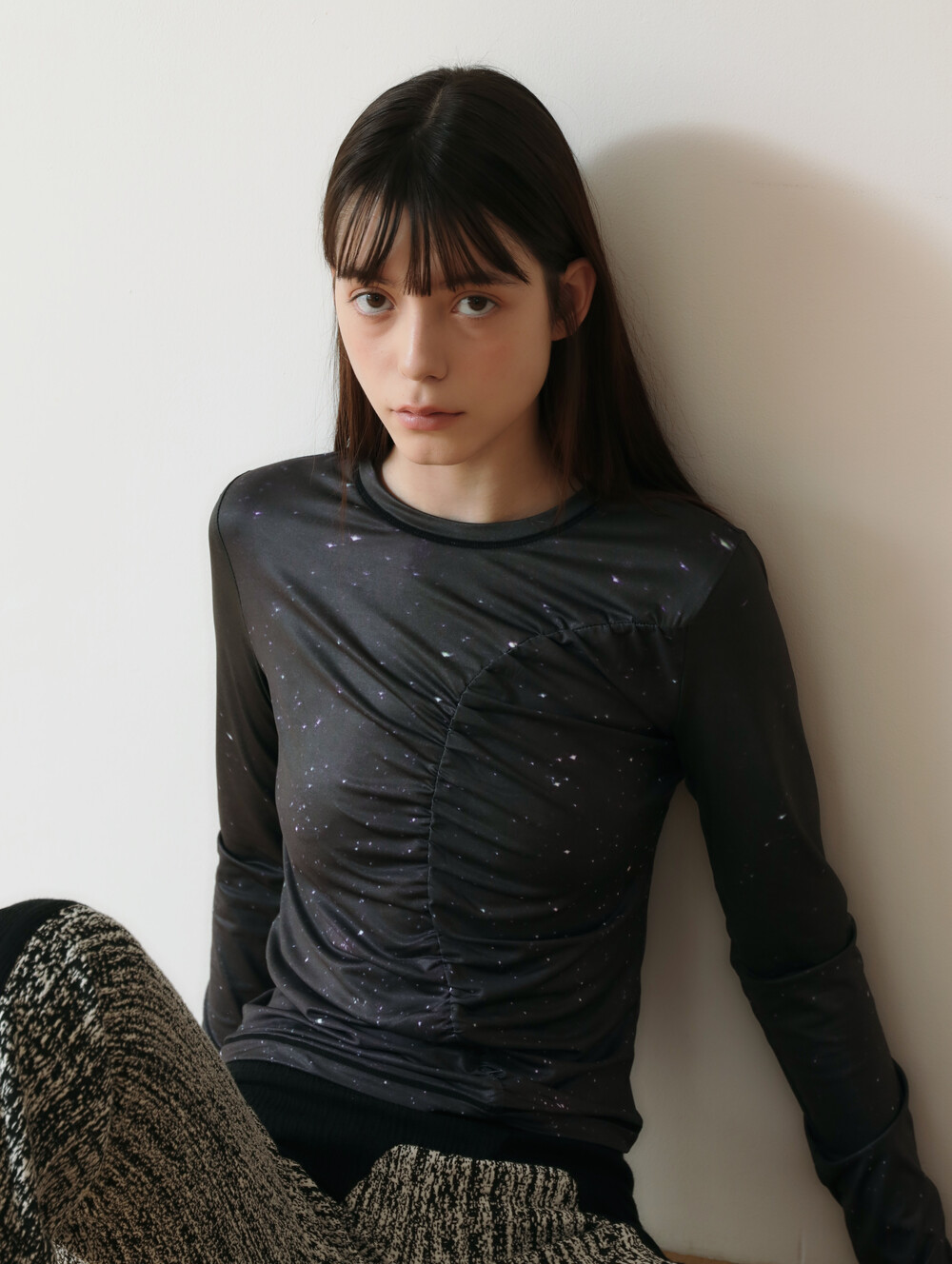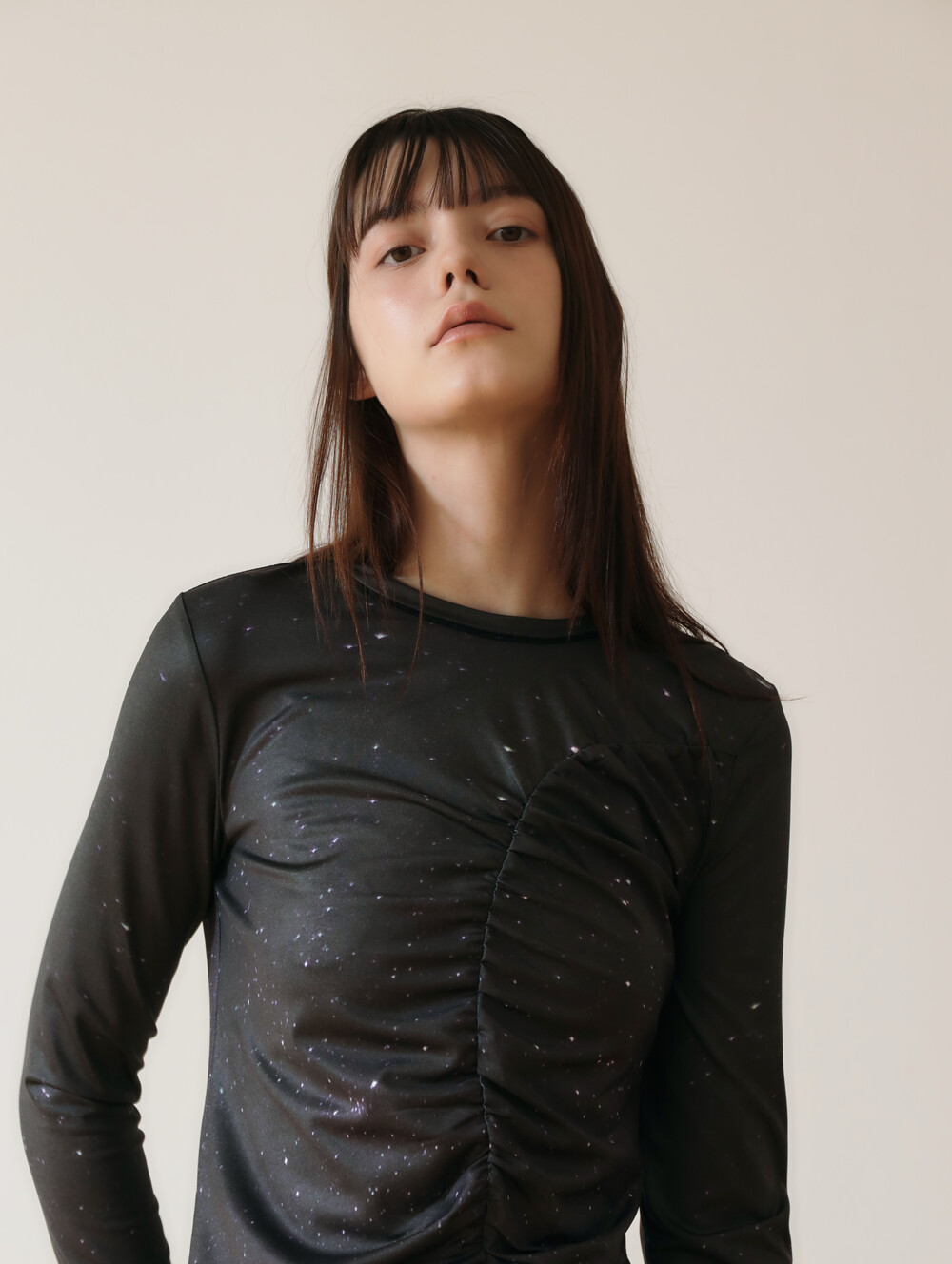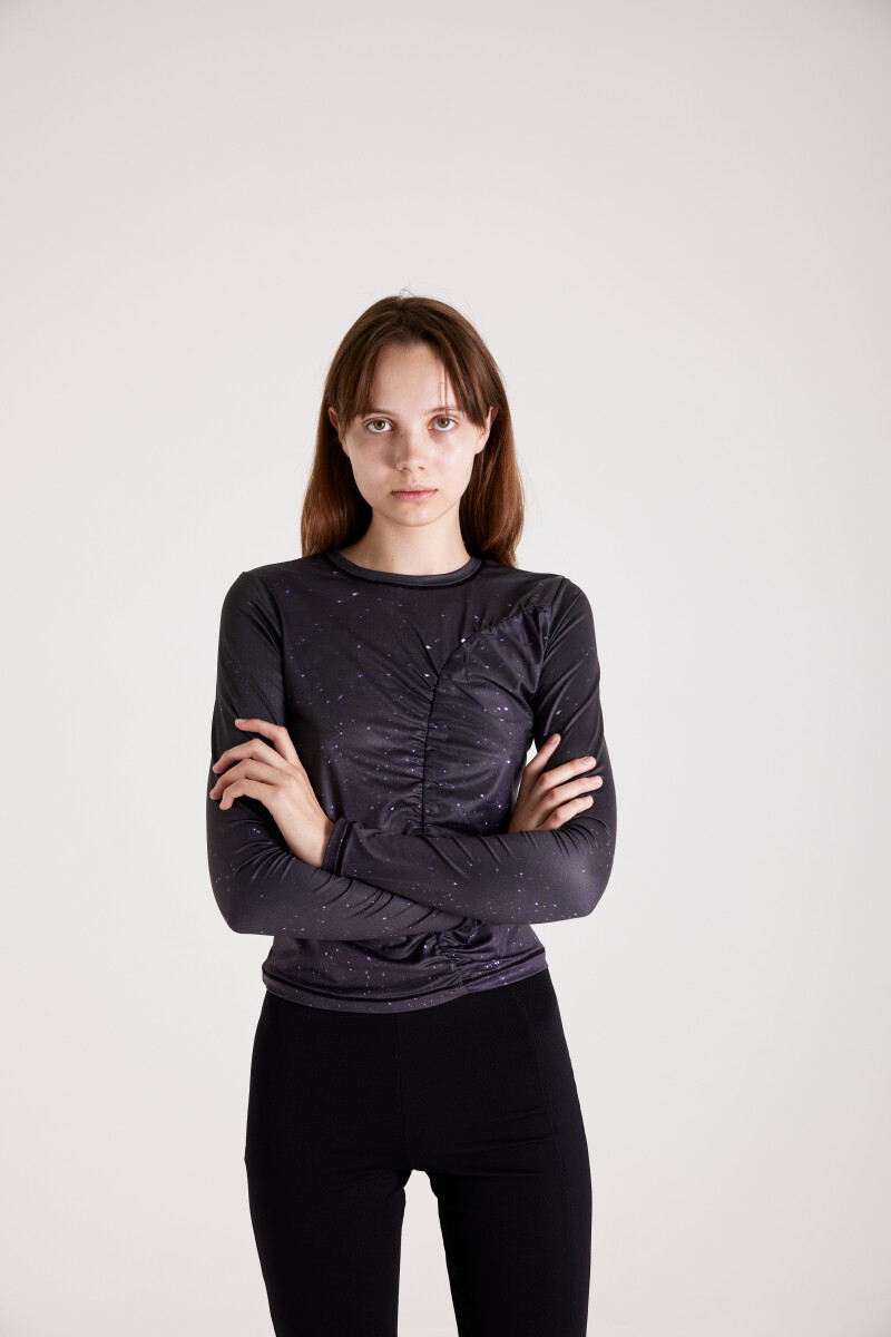 앞, 뒤로 셔링 디테일이 들어가는 티셔츠입니다. 앞판에는 고즈넉한 밤의 별을, 뒷판에는 보라색의 몽환적인 밤의 별을 디지털 프린팅한 슬림 져지 티셔츠입니다. 소매단에 핑거링과 겉으로 들어나는 아웃스티치가 포인트입니다.